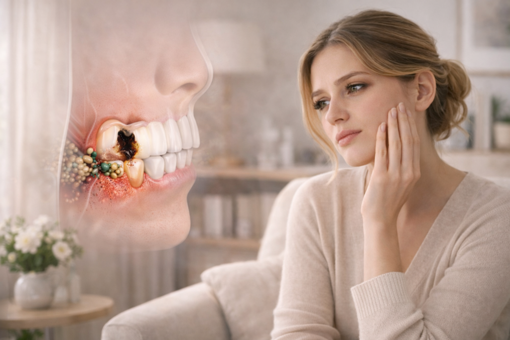 You may have had this feeling before: the problem does not seem to be only in your mouth. It is not that you never brush, and it is not that you clearly feel food stuck between your teeth all the time, but that not-fresh-enough feeling keeps coming back. Sometimes it does not even feel like ordinary “bad breath.” It feels more like something inside one tooth keeps failing to settle down, leaving one side of your mouth or a few specific teeth feeling less clean and less comfortable. Especially when you also deal with tooth sensitivity, food getting trapped easily, one tooth that occasionally feels off, or a strange taste that seems to linger in your mouth, it becomes very easy to wonder: maybe this is not just a brushing problem at all. Maybe cavities are affecting your breath.