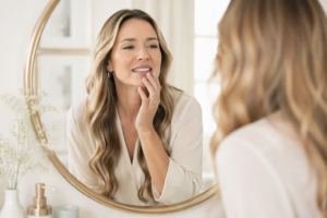 western woman thoughtfully checking her teeth in a refined mirror scene while considering whether whitening may feel too harsh